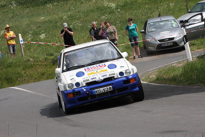 Mit ihrer langen Distanz war die erste Prüfung sehr wichtig, und es zeigte sich auch gleich wer heute um den Gesamtsieg kämpft. Wie erwartet legten die Favoriten Nicolas Hässler/Holger Suhl im starken Porsche 911 und Rainer Noller/Uwe Walz im Mitsubishi Evo 8 vor, direkt dahinter wu rde im Escort mit der dritten Gesamtzeit gestartet. Gejagt wurden Reinhard Honke/Benjamin Sauerborn von den starken heckgetriebenen BMW M3’s von Fritz Köhler und Werner Mühl, sowie Dominik Honke im Ford Sierra Cosworth. Auf den Prüfungen zwei und drei konnte man mit beherzter Fahrweise zwei viertbeste Zeiten fahren. Fritz Köhler, Gesamtsieger der letzten Rallye in Sonnefeld, war knapp vor dem Team Honke auf Position drei vorgefahren. Dafür konnte man sich von den restlichen Verfolgern auf dem zuschauerfreundlichen, direkt am Rallyezentrum gelegenen Rundkurs absetzen. Zur Halbzeit lag man 12 Sekunden hinter dem Spitzenreiter auf Gesamtposition vier, nur 9 Zehntel weg vom dritten Platz. Dieser sollte auf jeden fall realisiert werden. Waren in der ersten Schleife die Straßen noch trocken, durfte durch kurze Regenschauer jetzt an einigen Stellen mit nassen und rutschigen Stellen gerechnet werden, was für die Fahrer dementsprechend anspruchsvoll wurde.Nun wurde der Angriff auf den dritte Gesamtrang gestartet. Der absolut tadellos laufende Escort wurde am Limit über die knapp 8 Kilometer gescheucht und dem Vordermann über 5 Sekunden eingeschenkt. Es wurde nichts dem Zufall überlassen und auf der Vorletzten Prüfung eine zweitbeste Gesamtzeit hingelegt, sogar noch vor dem späteren Gesamtsieger. Auf dem abschließenden Rundkurs wurden die mittlerweile 7,3 Sekunden Vorsprung sicher verwaltet, und ohne Risiko der 3.Gesamtrang sowie der Klassensieg für das Rallyeteam Honke ges Die Veranstaltung wurde vom AMC Coburg vorbildlich organisiert und umgesetzt. So fanden sich sehr viele Zuschauer an den Prüfungen, besonders am städtischen Rundkurs wieder. Auch die Sprintprüfungen kamen bei den Teilnehmern sehr gut an, und das Rallyeteam Honke freut sich jetzt schon auf den Start zur 12. Auflage der Rallye „Rund um die Veste“ in Neustadt bei Coburg. Ihr Rallyeteam Honke |